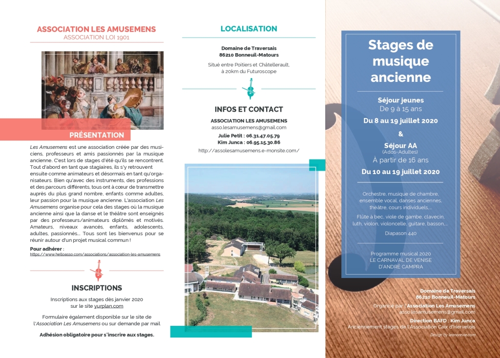 Stage de musique ancienne du 8-10 au 19 juillet 2020, à Bonneuil-Matours (86).