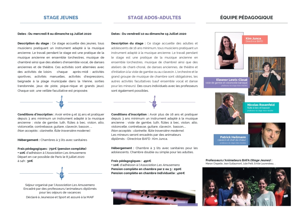 propose des stages d’été dans lesquels amateurs, musiciens de niveaux avancés, passionnés, adolescents ou adultes sont les bienvenus pour jouer de la musique ancienne, en musique de chambre, consort, cours individuels ou en orchestre,