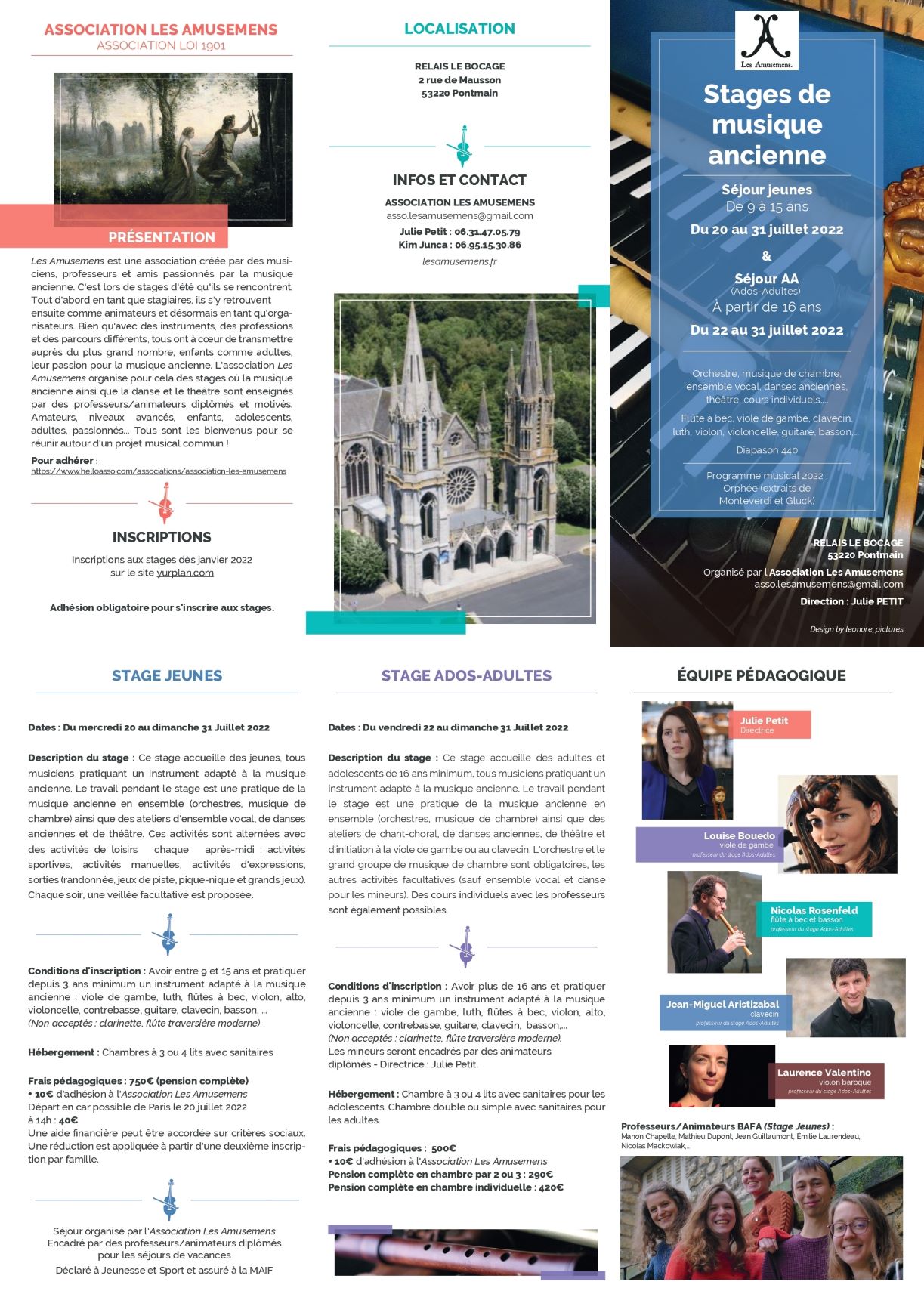Les Amusemens organise deux stages de musique ancienne, ouverts à tous les instruments adaptés à la musique ancienne. L’association a repris à partir de la saison 2020 l’organisation des stages de l’association Caix d’Hervelois, que cette dernière organisait depuis 1979. Elle propose donc maintenant deux stages de musique ancienne destinés l’un aux jeunes enfants (de 9 à 15 ans), l'autre aux adolescents et adultes (à partir de 16 ans).
