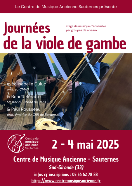 Le Centre de Musique Ancienne de Sauternes est ravi de proposer sa 3ème édition des Journées de la viole de gambe :