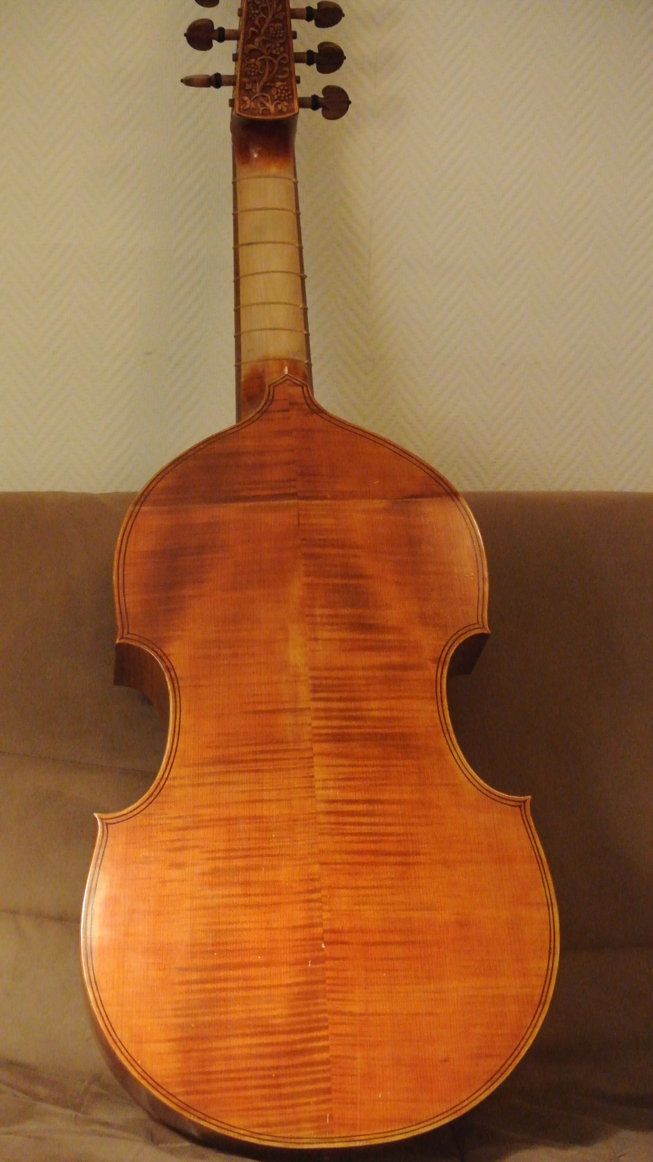 A vendre, cause nouvelle acquisition : basse de viole à 7 cordes, de Piotr Kowalzce, petit diapason - Très bien pour un amateur ou grand débutant, volute ajourée sculptée, confortable à jouer. Visible et disponible à l'essai dans le 20eme arrondissement de Paris - Fournie avec une housse ancienne. 3500€ (prix d'origine à la commande). Contactez Agnès 06 64 81 60 15