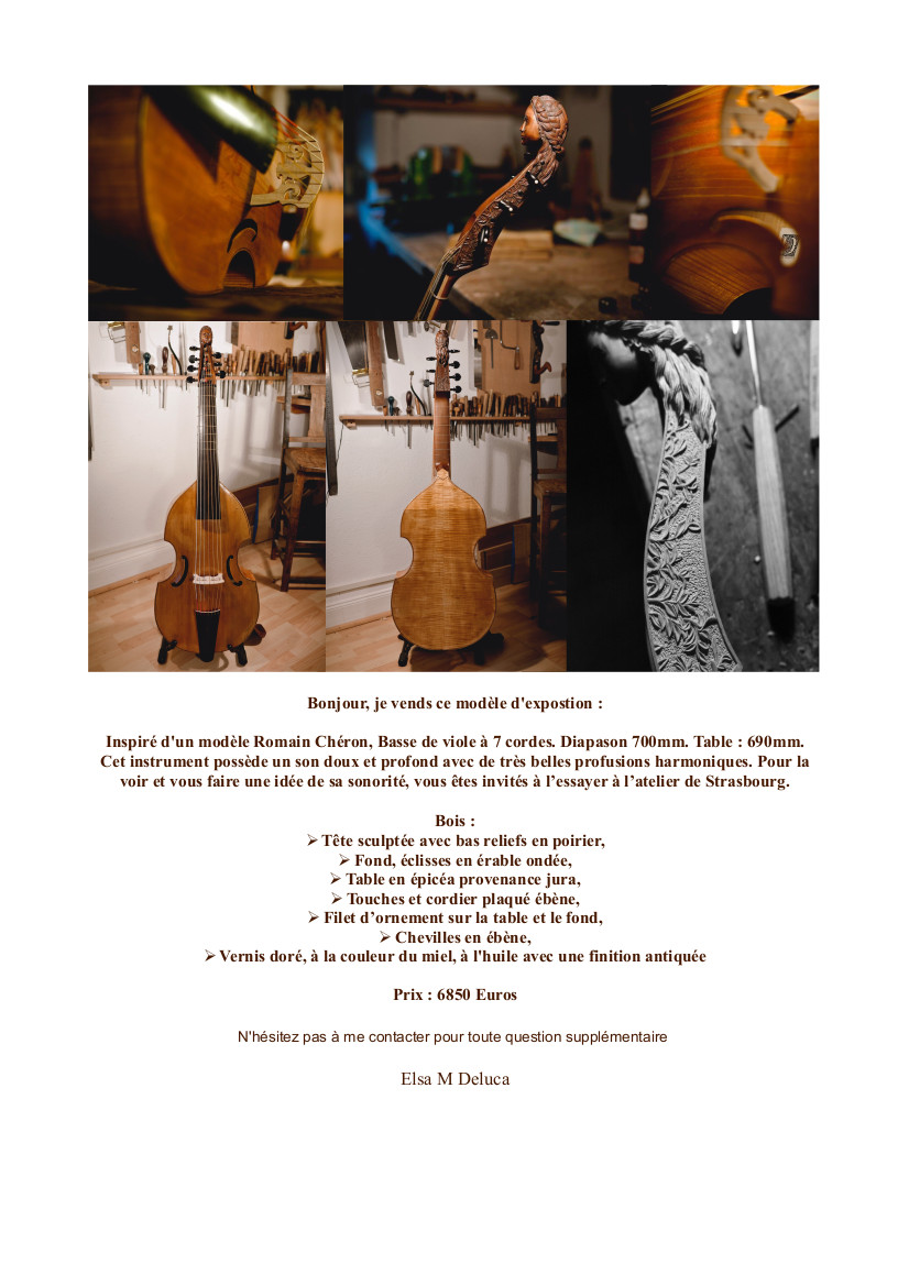 Inspiré d'un modèle Romain Chéron, Basse de viole à 7 cordes. Diapason 700mm. Table : 690mm.