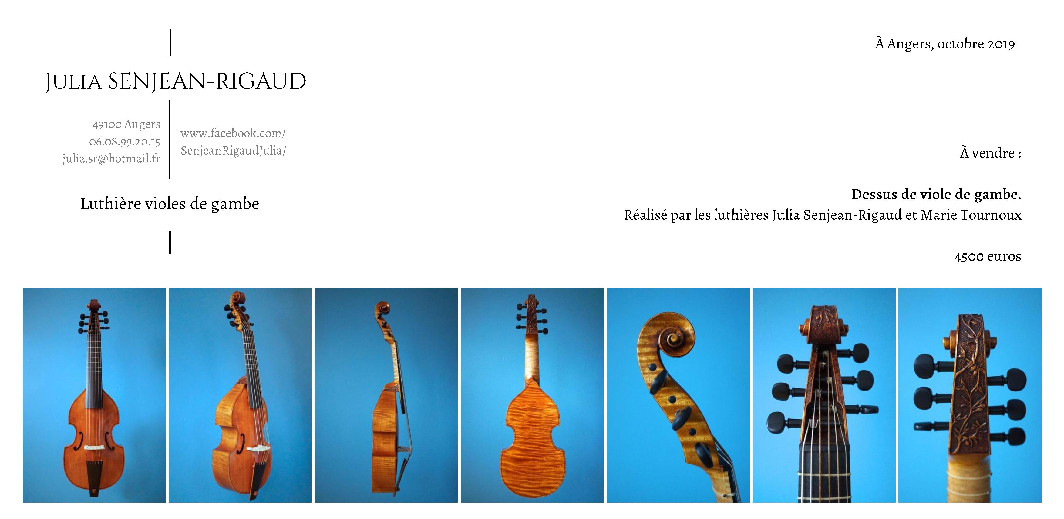 Bonjour, Nous venons de terminer, ma collègue Marie Tournoux et moi-même (Julia Senjean-Rigaud), la fabrication de ce dessus de viole très prometteur. Il est à vendre. Des photos de sa fabrication sont disponibles sur facebook ( https://www.facebook.com/SenjeanRigaudJulia ) ou sur mon site internet ( https://jusrlutherie.jimdo.com/ ).