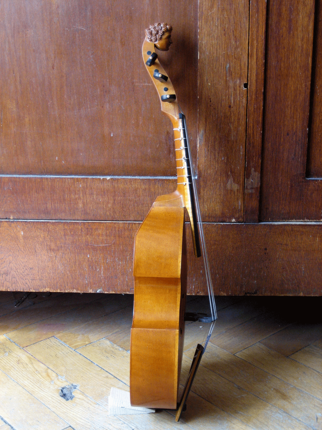 A vendre : Pardessus de viole 6 cordes fabriqué par Olimpia Mancewicz 2018, d'après Michel Collichon ca. 1690. Table d'harmonie en 4 parties d’épicéa, fond en 1 partie alisier. Eclises et manche en alisier. Placade de touche et cordier en bois de poirier. Tête de homme moustachu sculptée. Longueur vibrante 31,5 cm. Le son est fort et lumineux. Vendue avec housse. Prix total, avec housse: 3000€ A voir et essayer sur Varsovie (Pologne). D'autres photos sur demande. goldenviol@gmail.com