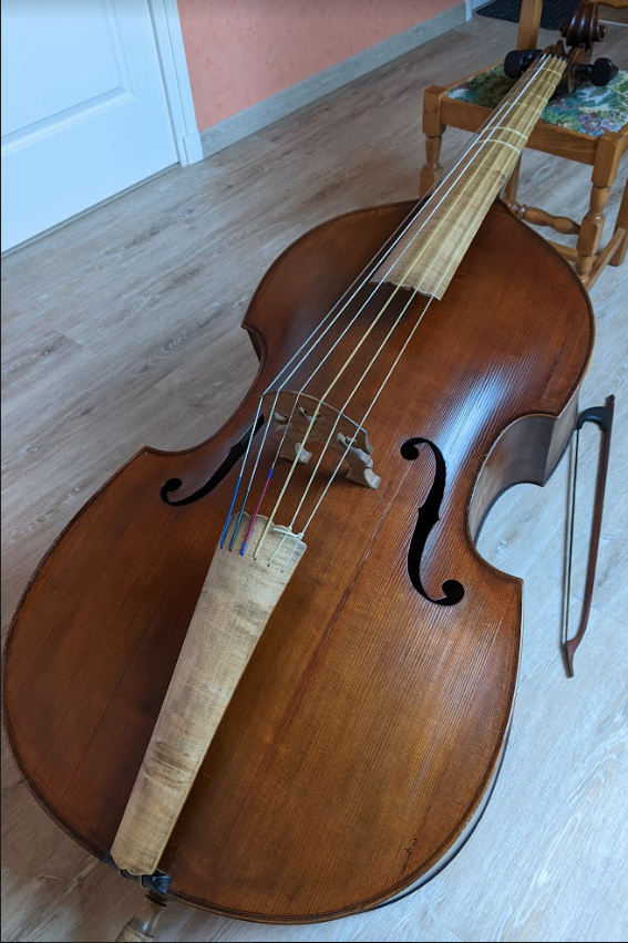 Contrebasse allemande fin xixe siècle (épaules basses et fond plat comme une viole) restaurée et montée en violone à 6 cordes en ré par Philippe Joannès en 1993.