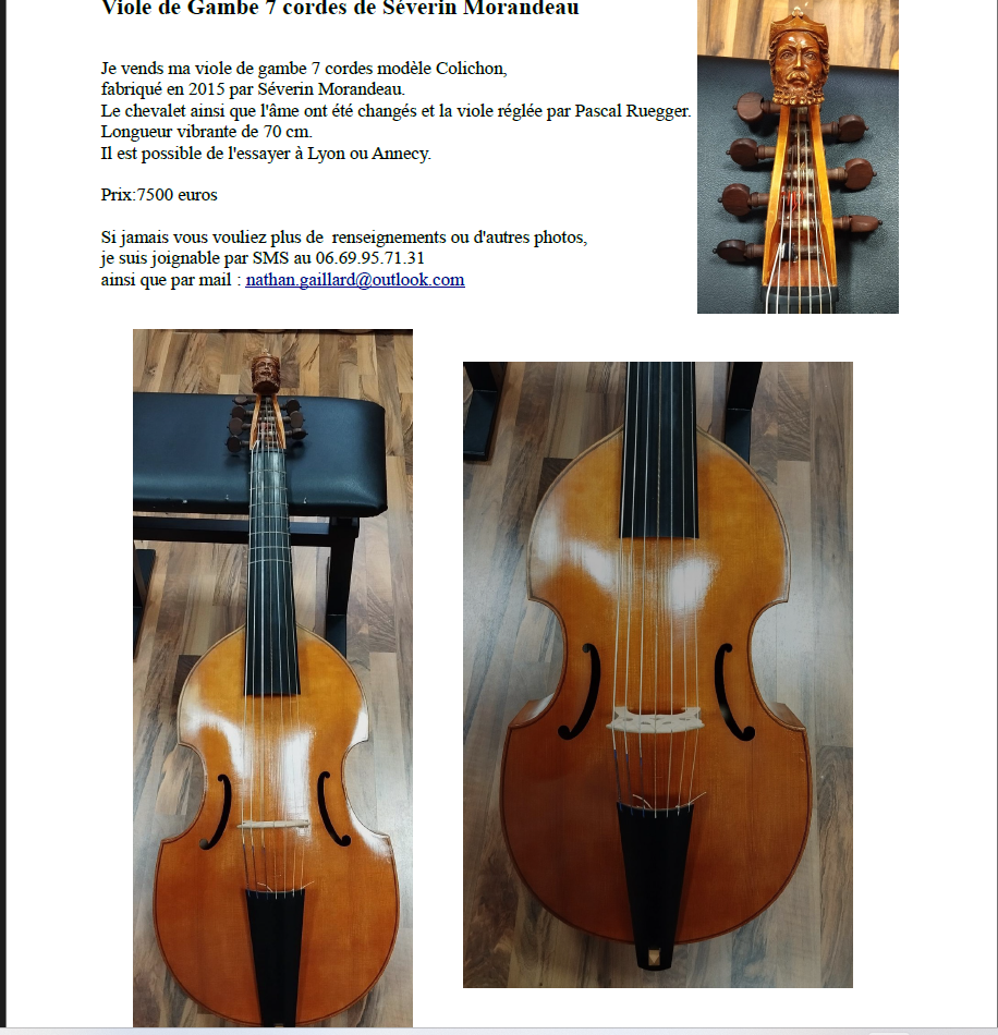 Je met en vente ma viole de gambe 7 corde de Séverin Morandeau modèle Colichon. Elle m'aura accompagné lors mes études au CNSMDL ainsi que pour de nombreux concerts.