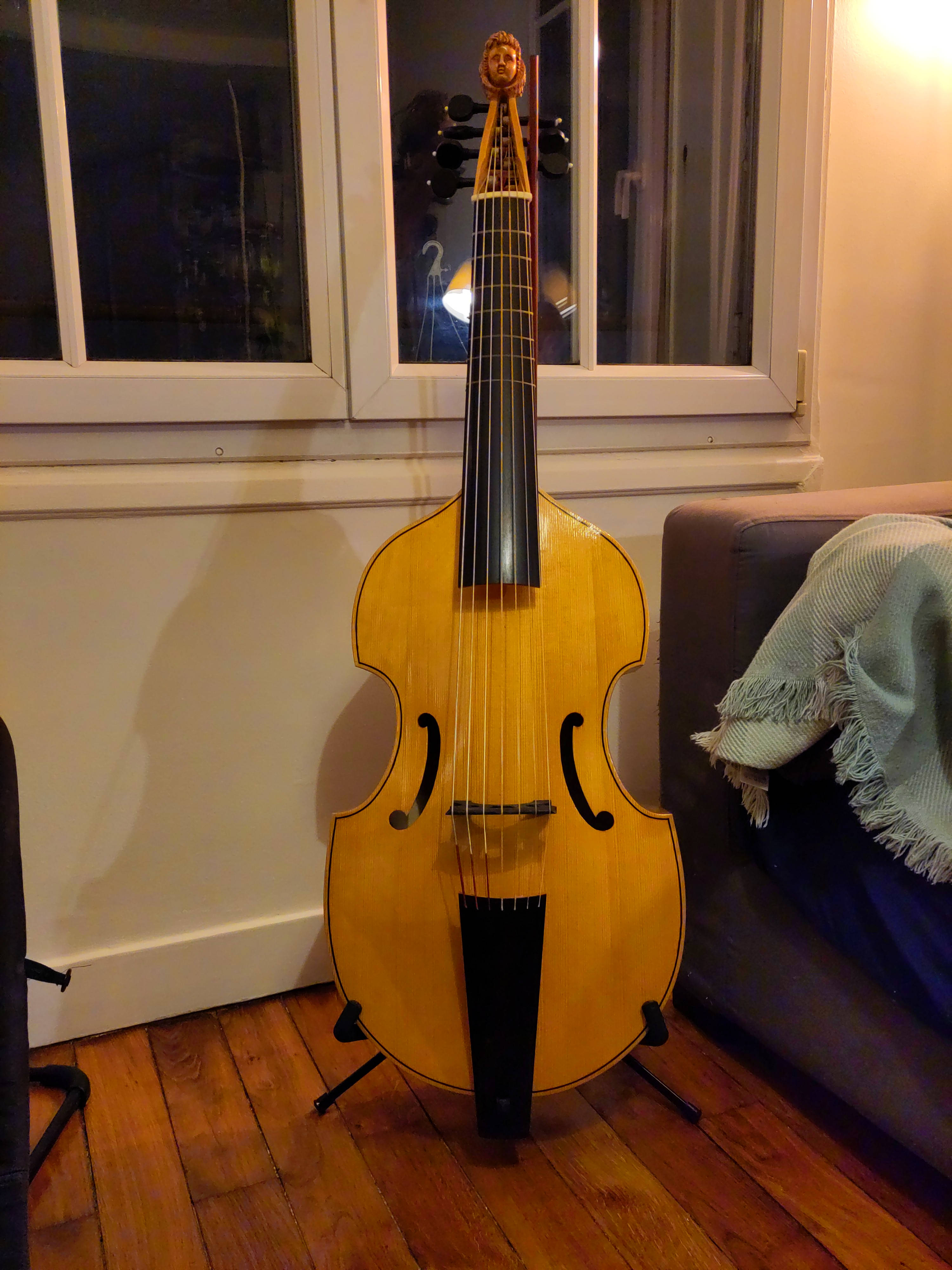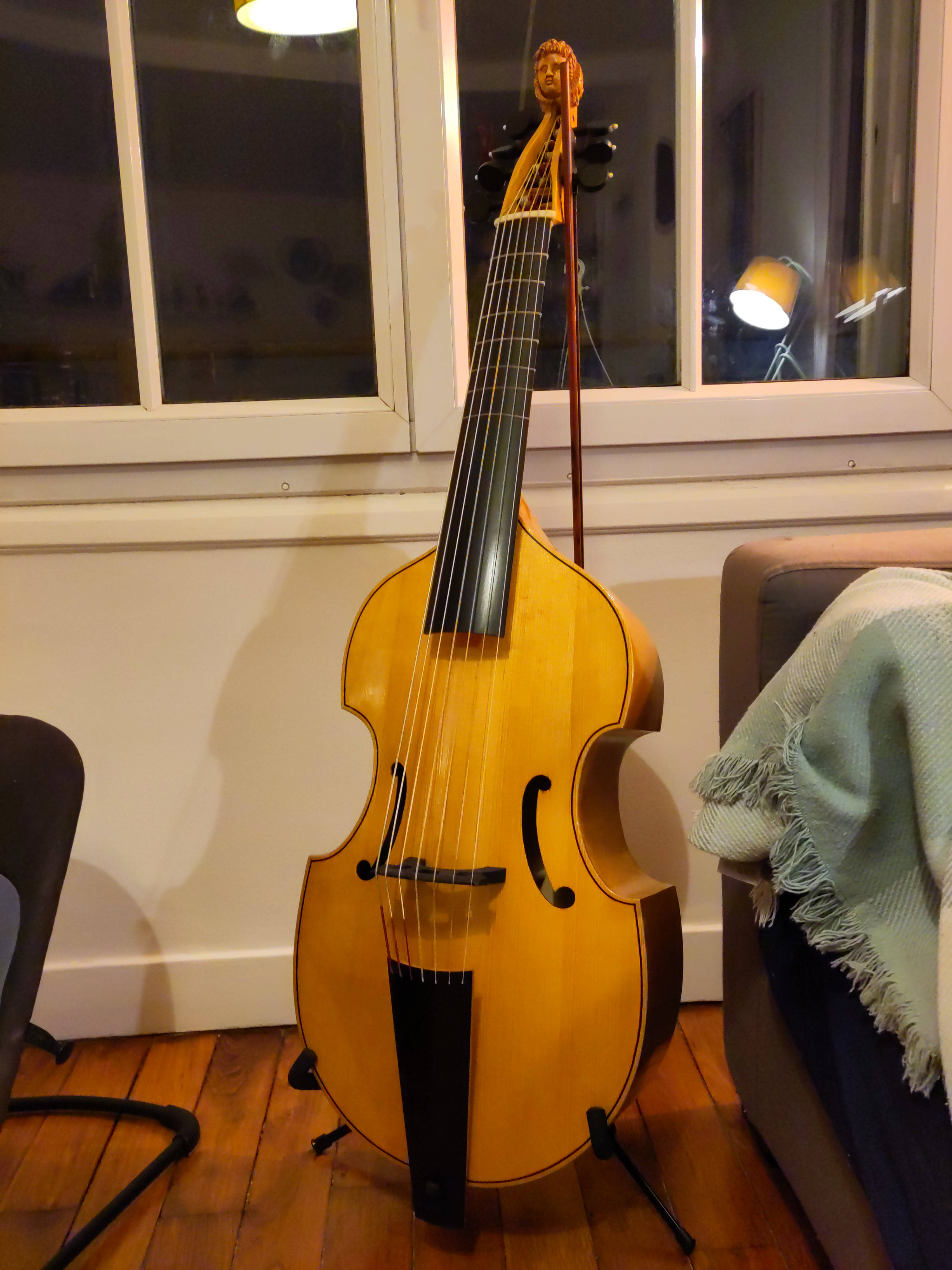 Je souhaite vous présenter mon instrument que je viens à peine d'acquérir, une basse de viole 7 cordes, baptisée "Le Passereau" par le luthier, basée sur le modèle de Michel Collichon qui se trouve au musée de la musique à Paris, créée par le luthier Jean-Louis Trocherie (le lien vers son site https://www.jeanlouistrocherie.com/). L'instrument sonne super bien et je ne peux que vous recommander le travail de ce luthier, assez récent sur le marché mais déjà très talentueux. J'utilise un archet de chez Claire Berget, archetière à Tours (https://archets-berget.fr/) que je vous recommande tout également.