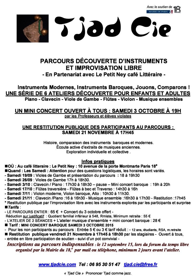 Pour bien démarrer l'année, l'association Tjad Cie (école de musique basée dans le 18ème arrondissement de Paris, ouverte aux petits et aux grands quel que soit votre âge, que vous soyez déjà musiciens ou pas !) vous propose en septembre, octobre et novembre un parcours de 6 ateliers pour découvrir des instruments modernes et baroques, dont la viole de gambe.