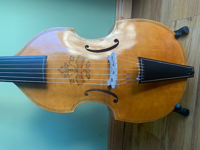 Basse de viole a 7 cordes a vendre, d'aprés Claude Perray, avec decorations d'aprés Guillaume Barbey, fabriquée en 2019 par le luthier Johan Collard, à Bois-Colombes.